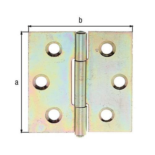 Ausführung: quadratisch, Gewerbeeinteilung bis 40 mm = dreiteilig, ab 50 mm = fünfteilig · mit vernietetem Edelstahlstift · Aufgrund von Umstellungen der Oberfläche kann dieser Artikel in unterschiedlichen Ausführungen (gelb-verzinkt, sendzimirverzinkt oder verzinkt-dickschicktpassiviert) geliefert werden. Weitere technische Eigenschaften: · Maß a: 38mm · Maß b: 38mm