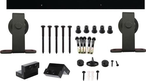 Komplettset für Holzflügel · das Set 1 Tür besteht aus: 2 Stahlschienen von 1000mm · 2 gelagerte Stahlhänger · 2 Türstopper aus Stahl · 2 Abstandhalter für die Tür · 1 Schiebetür-Bodenführung · Befestigungsmaterial · für Türstarke von 38 bis 40 mm · schwarz Weitere technische Eigenschaften: · Typ: Komplettset