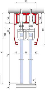 Schiebetürset EASY DOPPIO V-1200 für 2flg. Frei bewegliche Ganzglasschiebetüren bestehend aus: doppelläufiger Führungsschiene mit beidseitigem Verkleidungsprofil V-1101, Zubehörpaket mit 4 Klemmlaufwagen und 4 Endanschlägen, 1 Paar Endkappen Deckenmontage.