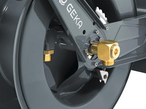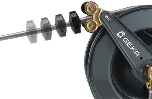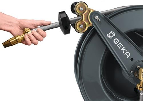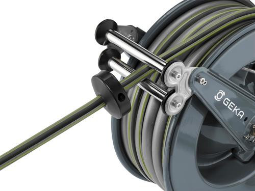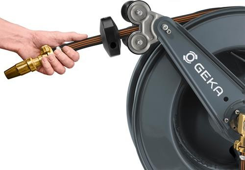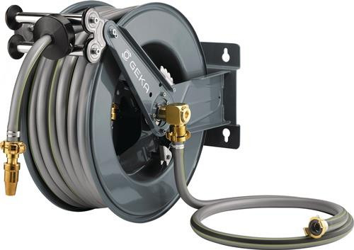 automatischer Rückzug des Schlauchs · schrittweise Arretierung aus der Distanz durch Zug am Schlauch möglich · geeignet für Wasser · mit GEKA® plus Winkeldreharmatur 90° aus Messing Material: Gehäuse: pulverbeschichteter Stahl · Schlauchführung: Rollen Edelstahl, Halterung Edelstahl · Schlauchstopper: Gummi schwarz · Zulaufrohr, Arretiermechanismus (Zahnscheibe, Einrastung, Feder, Sprengring) · Schrauben, Schlauchschutz-Feder: Edelstahl GEKA® plus Winkeldreharmatur: Messing Abmessungen: 60,6 x 33 x 53,1 cm Weitere technische Eigenschaften: · Gewicht: 34,3kg