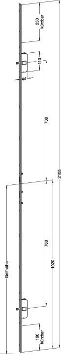 WINKHAUS Schließleiste solidLock G3 TU2407 L01 B2 TT; Produkttyp: Schließleiste; Produkttyp (Hersteller): Schlossschiene; Ausführung: 1-teilig; Verriegelungsart: Bolzenriegel; Stulpform: U-Stulp; Maßvariante/Typ: B2; Material: Stahl; Einsatzbereich: Mehrfachverriegelung; Türart: Vollblatt; Türausprägung: stumpf; Türflügelanzahl: einflügelig; Türwerkstoff: Stahl,Holz; Stulpausführung: kantig; DIN-Richtung: DIN Links-Rechts; geeignet: für Mehrfachverriegelung mit 2 Zusatzkästen; Zusatzfunktion-/Ausstattung: Fallenauflauf; Farbton: silberfarbig; Oberfläche: matt verchromt, gebürstet; Stulphöhe (U-Stulp): 6 mm; Stulpbreite: 24 mm; Stulplänge: 2.105 mm; Stulpstärke: 2 mm
