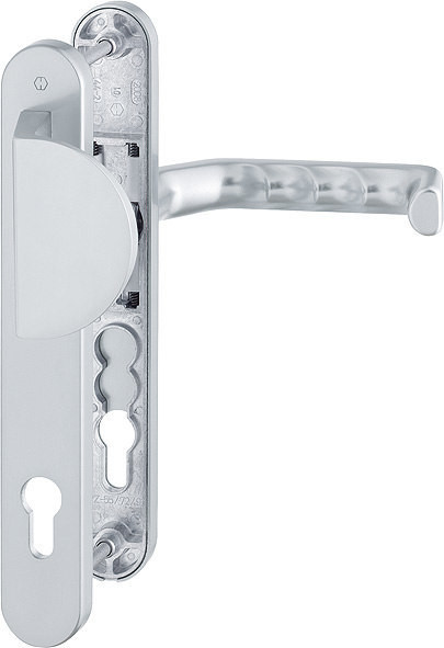 Garnitur / F1 Aluminium silberfarben / 8 mm / 40 mm vorst. / Profilzylinder 92 mm / 67-72 mm / HOPPE-Logo