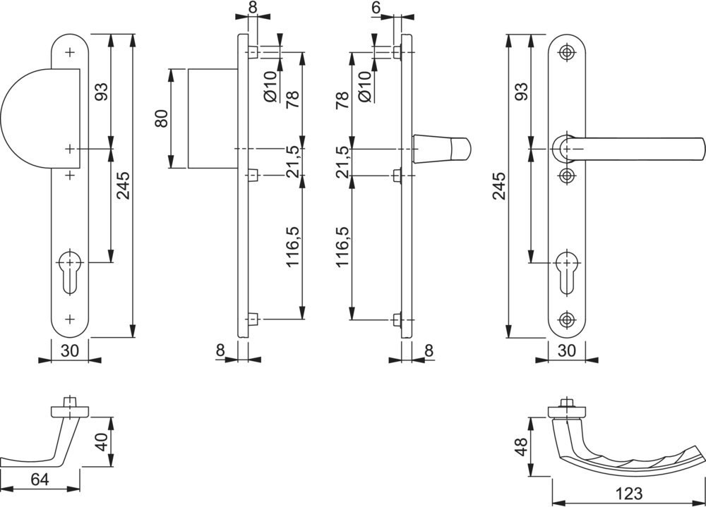 Garnitur / F9016 verkehrsweiß / 8 mm / 40 mm vorst., mit Aufsteck-/Reduzierhülse 8/10 mm / Profilzylinder 92 mm / 57-62 mm / HOPPE-Logo / 3 Nocken M6 verzinkt + Kunststoff / 78 mm Mitte obere Nocke/Mitte Griffloch