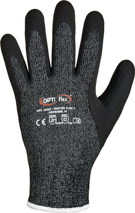 nach EN 388 · EN 511 · Kat. II · Material: 60% Polyacryl / 18% Polyethylen (HDPE) / 12% Polyamid (Nylon) / 10% Elastan, schwarz meliert · Beschichtung: Latex, gesandet, schwarz · nahtloser Mittelstrick (10gg) · hohe Griff- und Rutschsicherheit · Schnittschutzlevel C · Kälteschutz bis max. -30 °C · sehr gute Passform und Flexibilität · Anwendung: Kältebereich im Außenbereich bei denen mit Schnittverletzungen gerechnet werden muss, Straßenbau, Metallverarbeitung, Recycling Weitere technische Eigenschaften: · Werkstoffeignung Industrie: bedingt geeignet · Werkstoffeignung Montage + Werkstatt: sehr gut geeignet · Werkstoffeignung Logistik: sehr gut geeignet · Werkstoffeignung Handwerk: sehr gut geeignet · Abriebfestigkeit: 2 · EN-ISO-Schnittfestigkeit (Newton): C · Werkstoffeignung Bau + Garten: sehr gut geeignet · Weiterreißfestigkeit: 4 · Stichfestigkeit: 2