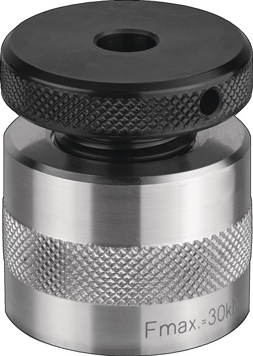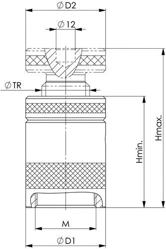aus Aluminium · Spindel: Vergütungsstahl brüniert · Trapezgewinde selbsthemmend, mit Endsicherung · Unterteil: Aluminium 400 N/mm² Zugfestigkeit · für empfindliche Maschinentische sowie Richt- und Messplatten Weitere technische Eigenschaften: · TR: 30 x 4mm · H min.: 70mm · Zentrierloch-Ø: 12mm · H max.: 100mm · Tragfähigkeit max.: 30kN · D2: 50mm · D1: 50mm