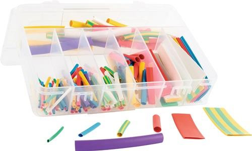127-teilig · mit Schrumpfschlauchabschnitten · Schrumpfrate 2:1: 30 Stk. 1.6 auf 0.8 mm (35 mm), 25 Stk. 2.4 auf 1.2 mm (35 mm), 20 Stk. 3.2 auf 1.6 mm (35 mm), 20 Stk. 4.8 auf 2.4 mm (35 mm), 16 Stk. 6.4 auf 3.2 (70 mm), 8 Stk. 9.5 auf 4.8 mm (70 mm), 8 Stk. 12.7 auf 6.4 mm (80 mm) · Betriebstemperatur von -55°C bis +125°C · flammwidrig
