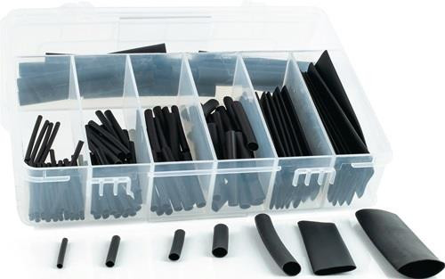 127-teilig · mit Schrumpfschlauchabschnitten · Schrumpfrate 2:1: 30 Stk. 1.6 auf 0.8 mm (35 mm), 25 Stk. 2.4 auf 1.2 mm (35 mm), 20 Stk. 3.2 auf 1.6 mm (35 mm), 20 Stk. 4.8 auf 2.4 mm (35 mm), 16 Stk. 6.4 auf 3.2 (70 mm), 8 Stk. 9.5 auf 4.8 mm (70 mm), 8 Stk. 12.7 auf 6.4 mm (80 mm) · Betriebstemperatur von -55°C bis +125°C · flammwidrig