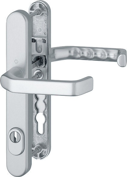 Schutz-Schmalschild-Garnitur mit ZAGarnitur / ES1 / F1 Aluminium silberfarben / 8 mm / Profilzylinder 92 mm / 67-72 mm / HOPPE-Logo