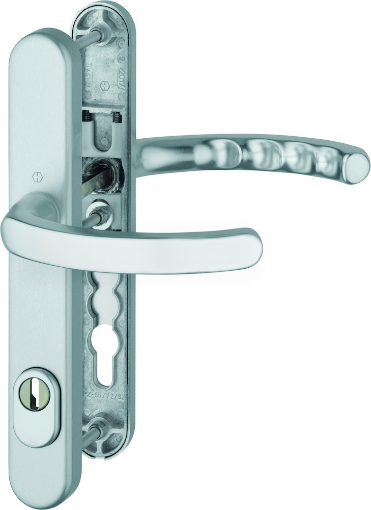 Garnitur / ES1 / F1 Aluminium silberfarben / 8 mm / Profilzylinder 92 mm / 67-72 mm / HOPPE-Logo / ZA5