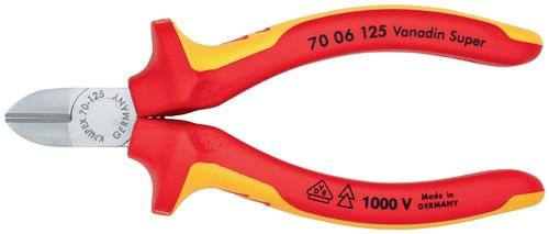 VDE-isoliert bis 1000 V · gefertigt gem. DIN EN/IEC 60900, stückgeprüft · schlanke Kopfform · sauberer Schnitt bei dünnen Cu-Drähten, auch an den Schneidenspitzen · Schneiden zusätzlich gehärtet, Schneidenhärte ca. 62 HRC · Vanadin-Elektrostahl, geschmiedet, mehrstufig ölgehärtet Zange verchromt