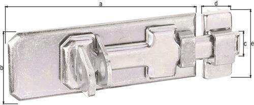mit flachem Griff bei vorgeschobenem Schieber sind die versenkten Schraublöcher der Riegelplatte abgedeckt, so dass ein Abschrauben unmöglich ist · die Schlaufe ist durch eine Einschlaglasche gesichert, die durch den vorgeschobenen Schieber verdeckt wird · Material: Stahl, Oberfläche: galvanisch verzinkt, dickschichtpassiviert mit befestigter Schlaufe · Aufgrund von Umstellungen der Oberfläche kann dieser Artikel in unterschiedlichen Ausführungen (gelb-verzinkt, sendzimirverzinkt oder verzinkt-dickschicktpassiviert) geliefert werden. Weitere technische Eigenschaften: · Maß e: 56mm · Maß a: 140mm · Maß b: 55mm · Maß c: 20mm · Oberfläche: galvanisch verzinkt, dickschichtpassiviert · Maß d: 24mm