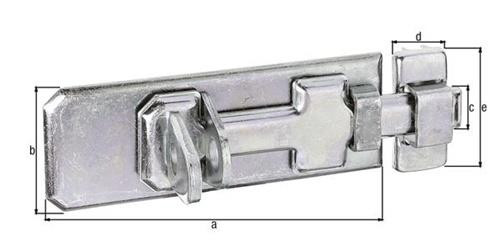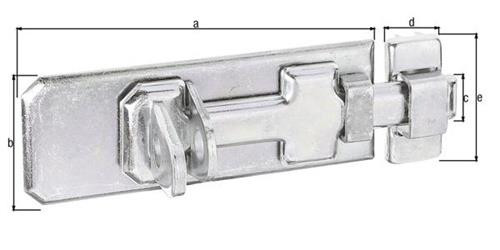 mit flachem Griff bei vorgeschobenem Schieber sind die versenkten Schraublöcher der Riegelplatte abgedeckt, so dass ein Abschrauben unmöglich ist · die Schlaufe ist durch eine Einschlaglasche gesichert, die durch den vorgeschobenen Schieber verdeckt wird · Material: Stahl, Oberfläche: galvanisch verzinkt, dickschichtpassiviert mit befestigter Schlaufe · Aufgrund von Umstellungen der Oberfläche kann dieser Artikel in unterschiedlichen Ausführungen (gelb-verzinkt, sendzimirverzinkt oder verzinkt-dickschicktpassiviert) geliefert werden. Weitere technische Eigenschaften: · Maß e: 41mm · Maß a: 80mm · Maß b: 35mm · Maß c: 13mm · Oberfläche: galvanisch verzinkt, dickschichtpassiviert · Maß d: 18mm