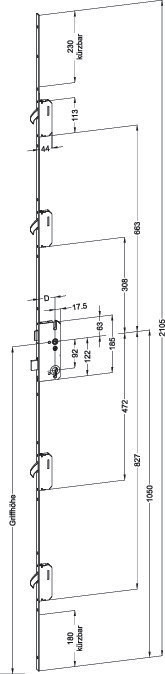 WINKHAUS Mehrfachverriegelung hookLock F2060 L03 M4; Produkttyp: Mehrfachverriegelung; Produkttyp (Hersteller): Mehrfachverriegelung; Ausführung: Schlüsselbetätigt; Verriegelung: über Schließzylinder,über Schließzylinder; Entriegelung: über Schließzylinder,über Schließzylinder; Verriegelungsart (Zusatzverriegelung): Schwenkriegel; Drückernuss: einteilig; Anzahl Verriegelungen: 5 St.; Tagesfallenfunktion: Nein; Stulpform: Flachstulp; Material Stulp: Stahl; Schlossriegel: 2 tourig; Riegeleigenschaft: Standard; Schlosskasten: geschlossen; Schlosskastenhöhe: 185 mm; Wechsel: mit Wechsel; Material Zusatzriegel: Stahl; Norm: DIN 18251; Schlossklasse: Klasse 3; Türart: Objekttür; Türflügelanzahl: ein- und zweiflügelig; Türwerkstoff: Aluminium,Holz,Kunststoff; Türvariante: standard; Maßvariante/Typ: M4; Dornmaß: 45 mm; Hinterdornmaß: 17,5 mm; Drückernussvierkant: 8 mm; Entfernung: 92 mm; Lochung: Profilzylinder gelocht; DIN-Richtung: DIN Links-Rechts; Stulpausführung: kantig; Stulpbreite: 20 mm; Stulplänge: 2.105 mm; Stulpstärke: 3 mm; Farbton Stulp: silber; Material Falle: Zinkdruckguss; Riegelausschluss: 20 mm; Einbautiefe Hauptschlosskasten: 59,5 mm; Oberfläche Stulp: matt verchromt; Zertifikate: SKG2*; Flügelfalzhöhe min.: 1.875 mm; Flügelfalzhöhe max.: 2.230 mm; Drückerhöhe: 1.050 mm; Stulp kürzbar oben: 230 mm; Stulp kürzbar unten: 180 mm