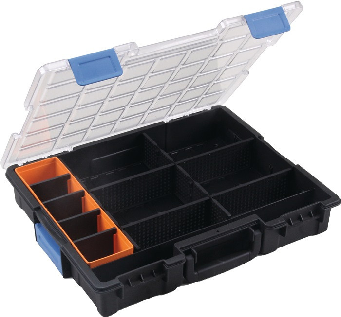 B 440 x T 355 x H 76 mm · Innenmaß B 400 x T 320 x H 60 mm · Kunststoff (PP/PS) · schwarz, mit transparentem, fest schließenden Deckel · individuelle Aufteilung durch herausnehmbare Trennstege · Verbindungsverschluss ermöglicht den Transport von bis zu 3 Sortimentskästen