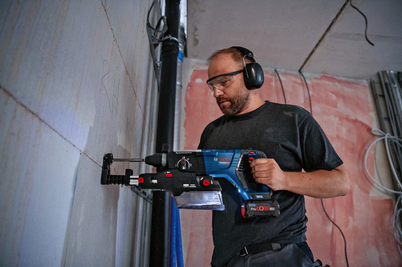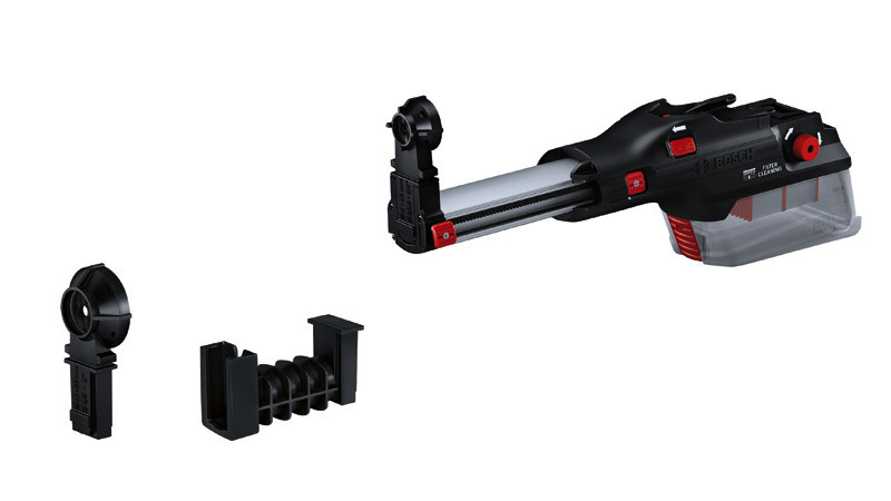 Integrierter Sauger GDE 28 D, Leichte, integrierte Staubabsaugung: der GDE 28 D Professional. Die sehr kompakte und leichte Bauweise (nur 0,8 kg) sorgt für eine ausgezeichnete Ergonomie. Der Sauger lässt sich mit einem einzigen Klick montieren und die Staubbox kann bequem entleert werden, ohne dass der Filter entfernt werden muss. Sein Filterreinigungsmechanismus, der den HEPA-Filter ausklopft, unterstützt einen konstanten Luftstrom und sorgt für ausgezeichnete Ergebnisse bei der Staubabsaugung. Durch seine hohe Flexibilität dank zwei austauschbarer Staubaugen zum Bohren bis 28 mm Durchmesser und einer Erweiterung für Aufsätze bis 265 mm Länge ist er ideal für zahlreiche Anwendungen. Der integrierte Staubsaugeradapter eignet sich für die Verwendung mit dem GBH 18V-28 DC Professional beim Bohren oder Hammerbohren. Der GDE 28 D Professional verfügt über eine transparente Staubbox zur Überprüfung des Füllstands und Einstellung der Bohrtiefe. Festbohrfutter mit Staubauge, 16 mm Durchmesser (1 600 A01 E28). Festbohrfutter mit Staubauge, 28 mm Durchmesser (1 600 A01 E29). Verlängerung (1 600 A01 E27). Karton