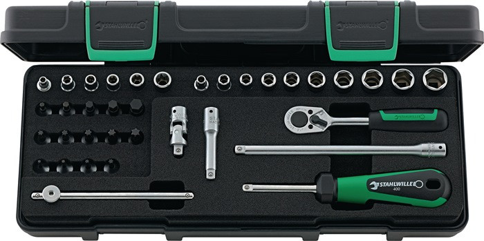 6,3 mm (1/4 ″)-Vierkantantrieb · Inhalt: je 1 6-kant Steckschlüssel-Einsatz SW 5 / 5,5 / 6 / 7 / 8 / 9 / 10 / 11 / 12 / 13 mm je 1 Steckschlüssel-Einsatz für Schrauben mit Außen TORX®-Profil Gr. E 4 / 5 / 6 / 7 / 8 / 10 je 1 Steckschlüssel-Einsatz für Schrauben mit Innensechskant-Profil SW 3 / 4 / 5 / 6 / 8 mm je 1 Steckschlüssel-Einsatz für Schrauben mit Innen-TORX®-Profil Gr. T 8 / 9 / 10 / 15 / 20 / 25 / 27 / 30 / 40 1 Hebel-Umschaltknarre (22 Zähne) mit 2-Komponenten-Griff je 1 Verlängerung 54 / 150 mm 1 Kardangelenk 1 Handgriff mit Vierkant 1 Quergriff Weitere technische Eigenschaften: · Material: Chrom-Alloy-Stahl · Rückschwenkwinkel: 16,4°