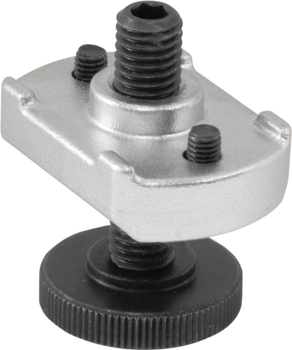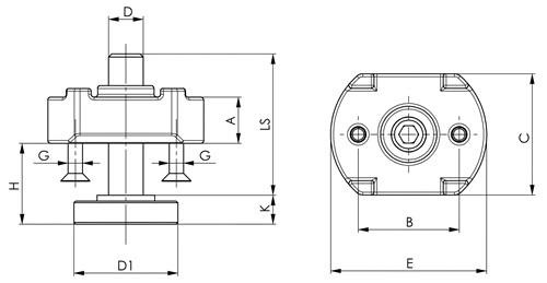 Stahl verzinkt und vergütet · Stützschraube vergütet · Festigkeitsklasse 8.8 · bestehend aus Druckstück, Stützschraube und Befestigungsschrauben · Anwendung: Die Stützverlängerung wird zur Vergrößerung der Spannhöhe auf den Gegenhalter des Krokodils geschraubt Weitere technische Eigenschaften: · LS: 94mm · B: 35mm · H: 10-80mm · K: 10mm · E: 54mm · C: 42mm · A: 16mm · D: M12 · G: M5 · D1: 36mm