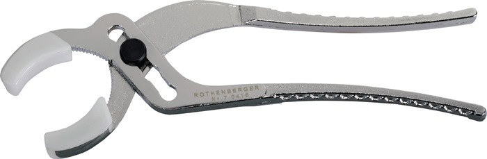 Chrom-Vanadium-Spezialstahl, ganzstahlgeschmiedet, verchromt · im Gelenk 4-fach verstellbar, mit gezahnten Greifbacken · Kunstftoffbacken für sicheres und schonendes Greifen von wertvollen Armaturen ohne Beschädigung von polierten Oberflächen · optimale Greifform ideal zum Anziehen von Kunststoffrohrschraubverbindungen bis Ø 62 mm (Siphon)