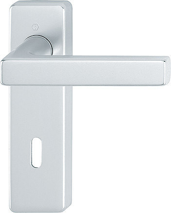 Garnitur / F1 Aluminium silberfarben / 8 mm / Ovalbart 72 mm / 40-45 mm / fest/drehbar Kugelarretierung mit Rückholfeder / HOPPE-Logo