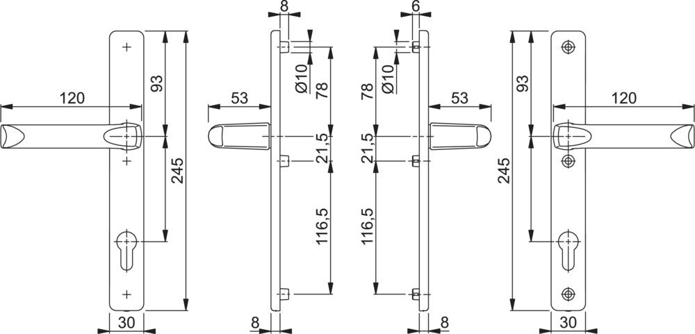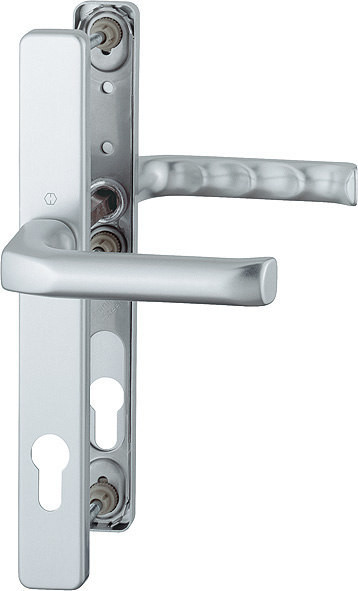 Garnitur / F1 Aluminium silberfarben / 8 mm / Profilzylinder 92 mm / 67-72 mm / HOPPE-Logo / 3 Nocken M6 verzinkt + Kunststoff / 78 mm Mitte obere Nocke/Mitte Griffloch / Schrauben 80 mm