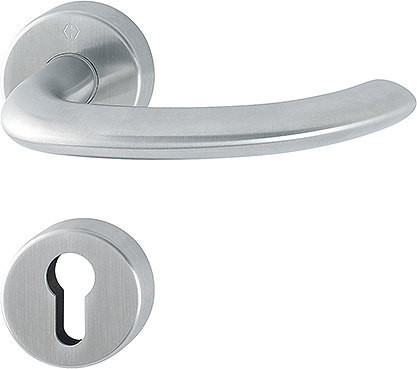 Garnitur / F69 Edelstahl matt / 8 mm / Profilzylinder / 40-45 mm / fest/drehbar Kugelarretierung mit Rückholfeder / HOPPE-Logo