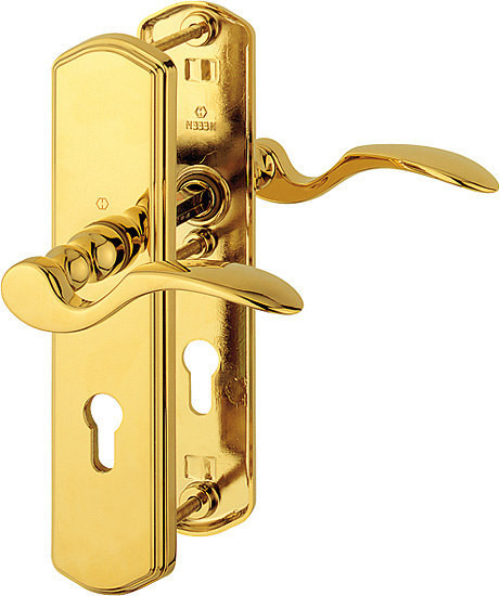 Garnitur / links / Erfüllt keine normative Schutzklasse / F77-R messingf. poliert - Resista® / 8 mm / Profilzylinder 72 mm / 37-42 mm / HOPPE-Logo