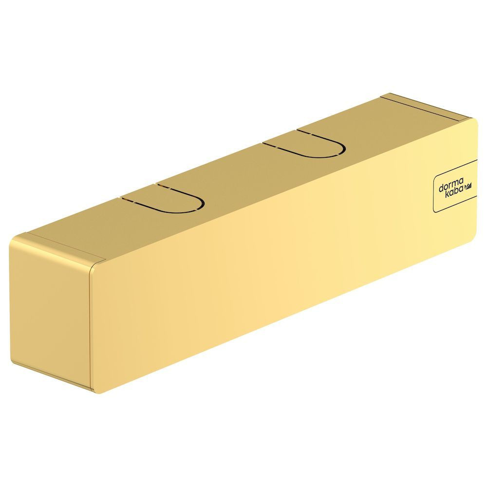 Obentürschließer für Gleitschienen im XEA Design, Türblattmontage auf der Bandseite, Sturzmontage auf der Bandgegenseite, mit zweitem Schließbereich (15°-0°), mit Dekorblende aus Metall und Montageplatte. Gold P 750.