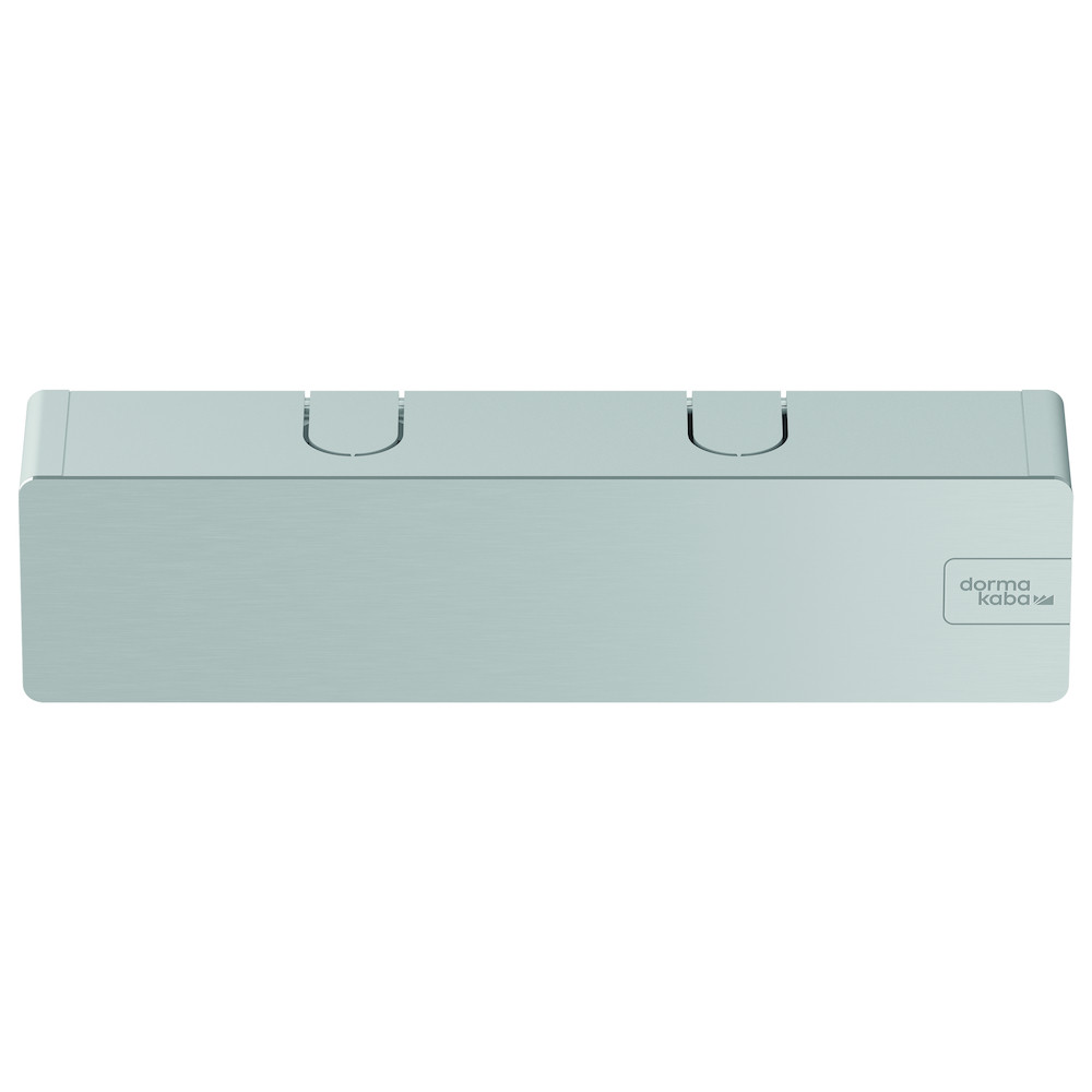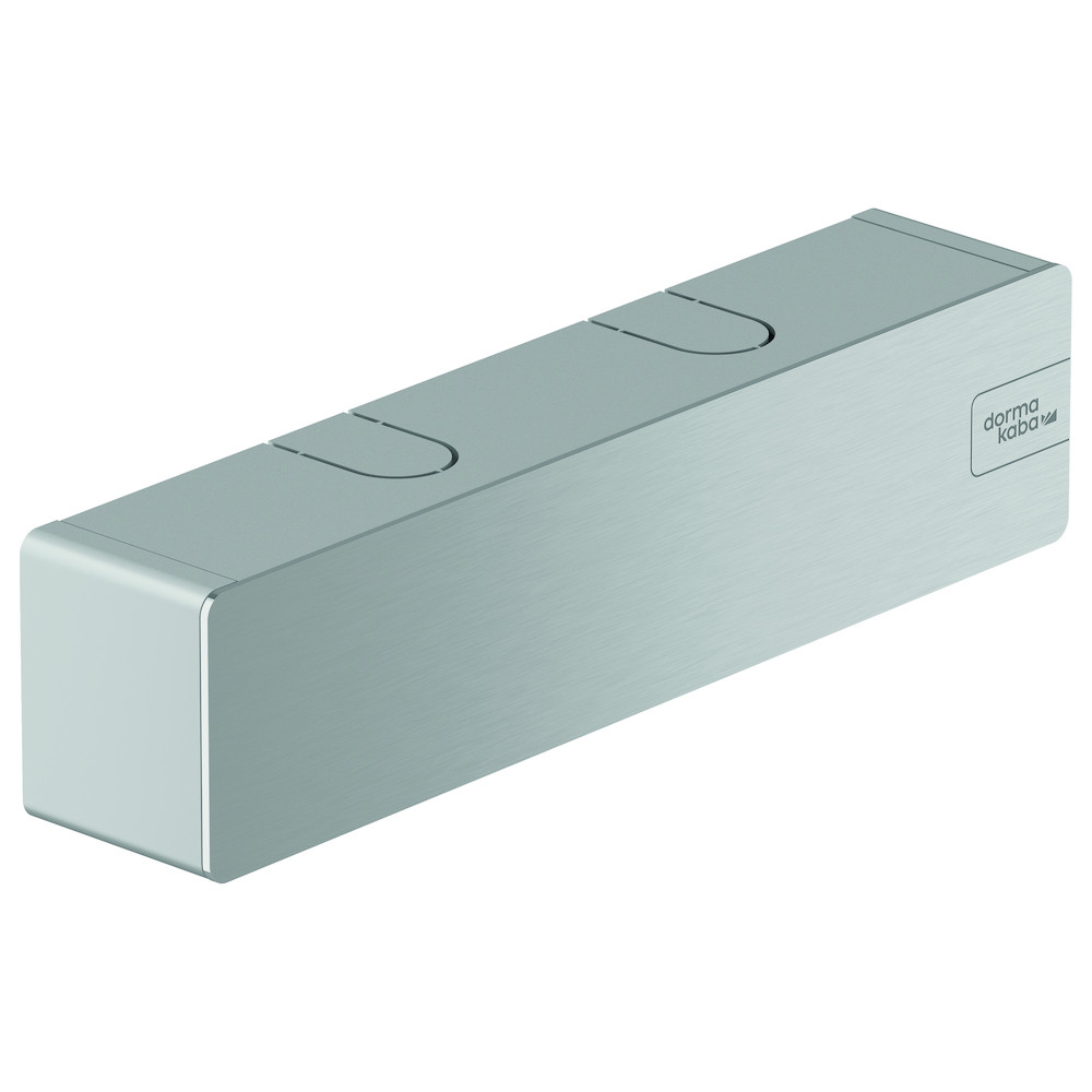 Obentürschließer für Gleitschienen im XEA Design, Türblattmontage auf der Bandgegenseite, Sturzmontage auf der Bandseite, mit zweitem Schließbereich (15°-0°), mit Dekorblende aus Metall und Montageplatte. Edelstahlfarben P 700.