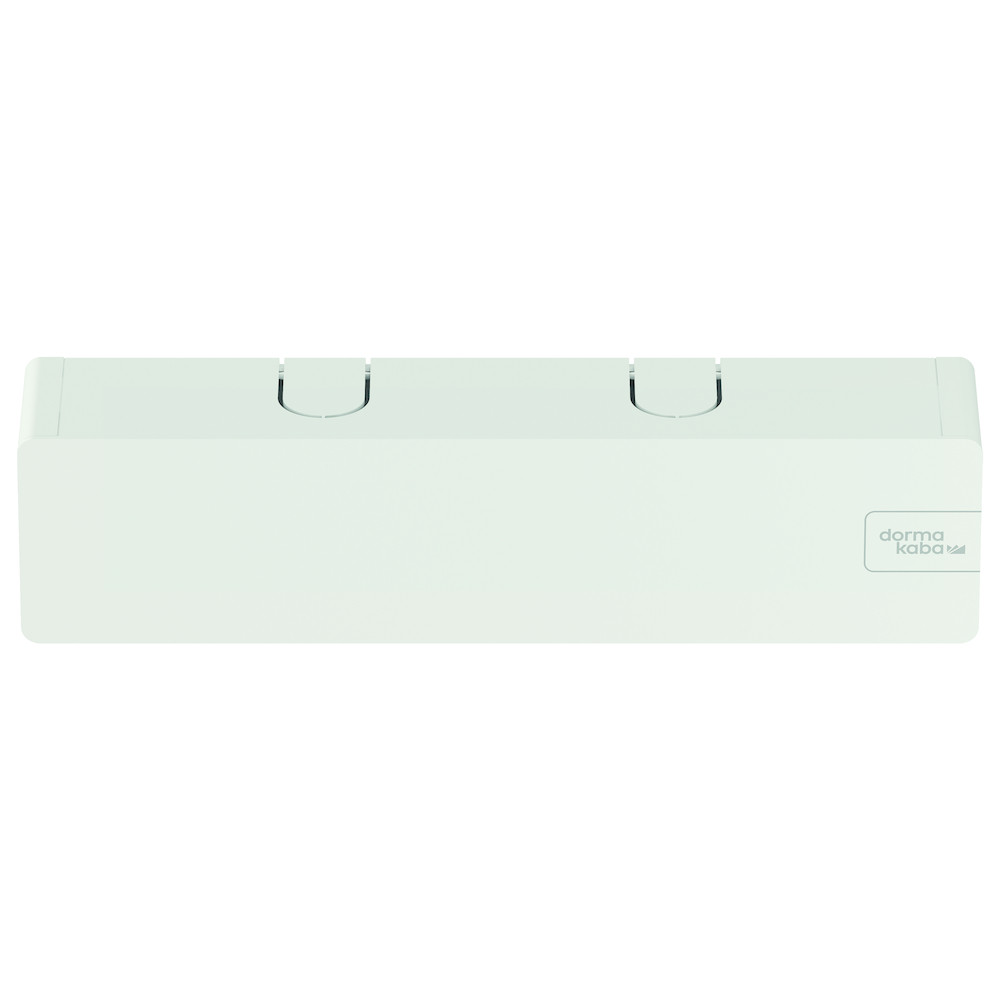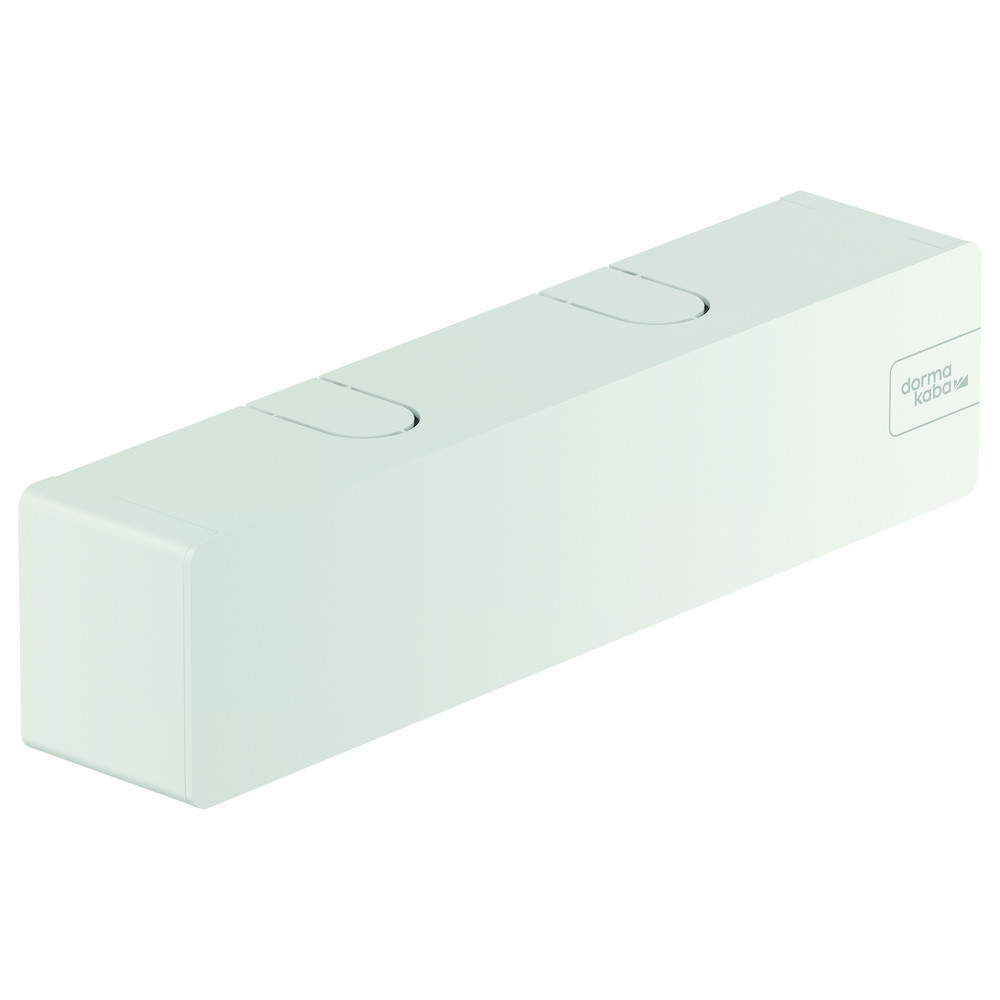 Obentürschließer für Gleitschienen im XEA Design, Türblattmontage auf der Bandgegenseite, Sturzmontage auf der Bandseite, mit zweitem Schließbereich (15°-0°), mit Dekorblende aus Metall und Montageplatte. Weiß P 100.