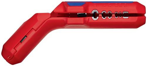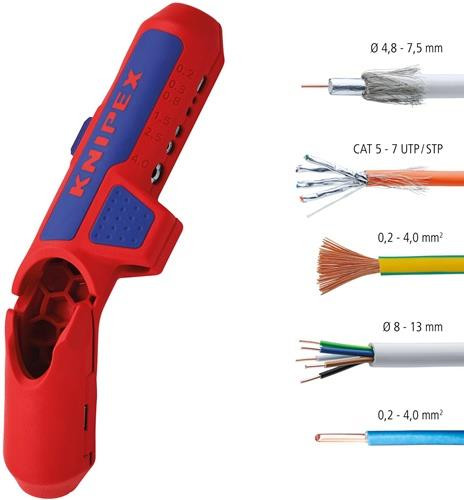 zum Abmanteln und Abisolieren · Rund- und Feuchtraumkabel von Ø 8 - 13 mm (z. B. NYM-Kabel 3 x 1,5 mm² bis 5 x 2 mm²) · Datenkabel (CAT 5 bis CAT 7), Twisted-Pair (UTP / STP) und Koaxial-Kabel (4,8 - 7,5 mm) · für die Querschnitte 0,2, 0,3, 0,8, 1,5, 2,5 und 4,0 mm² · tiefliegende Kabeleingänge leicht erreichen Art.-Nr. 8000 272 707: für Linkshänder Weitere technische Eigenschaften: · Feder: mit Öffnungsfeder · Gewicht: 74g · Griffart: glasfaserverstärktes Polyamid