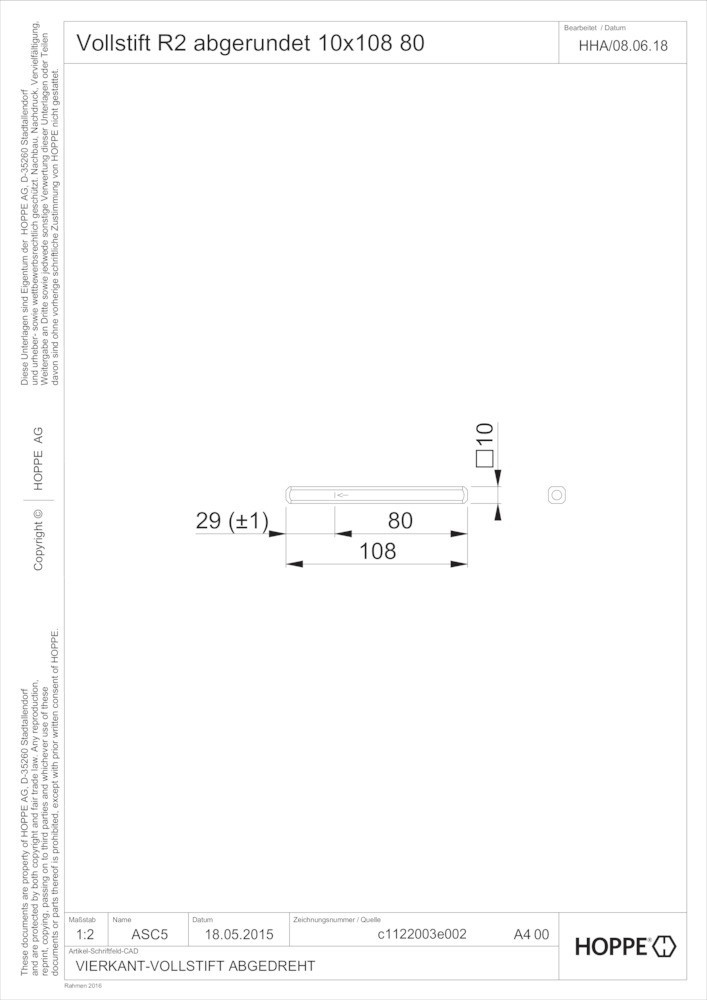 Vierkant-Vollstift R2 10 mm / 108 mm / für 80 mm vorst.
