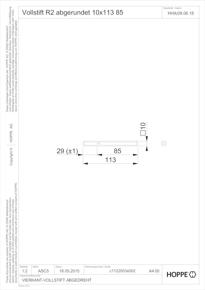 Vierkant-Vollstift R2 10 mm / 113 mm / für 85 mm vorst.