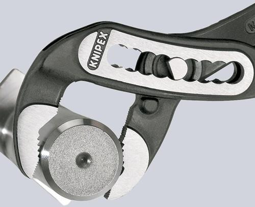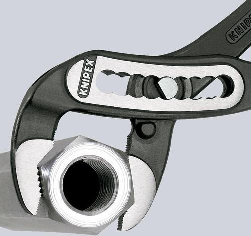 Länge: 9-stufige Rastenverstellung für 30 % mehr Greifkapazität · selbstklemmend an Rohren und Muttern · Klemmschutz · Greifflächen mit spezialgehärteten Zähnen · Härte der Zähne ca. 61 HRC · Klemmschutz · Chrom-Vanadin-Elektrostahl, geschmiedet, mehrstufig ölgehärtet Zange schwarz attramentiert · Kopf poliert Weitere technische Eigenschaften: · Länge: 250mm · Griff: Kunststoffüberzug · Kopf: poliert · Rohr-Ø: 50mm · Einstellpositionen: 9