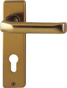Zimmertür Drückergarnitur Modell London mit geradem Kurzschild mit Anschlagplatte, Verschraubung sichtbar mit Holzschrauben, mit Profilstift-Verbindung.