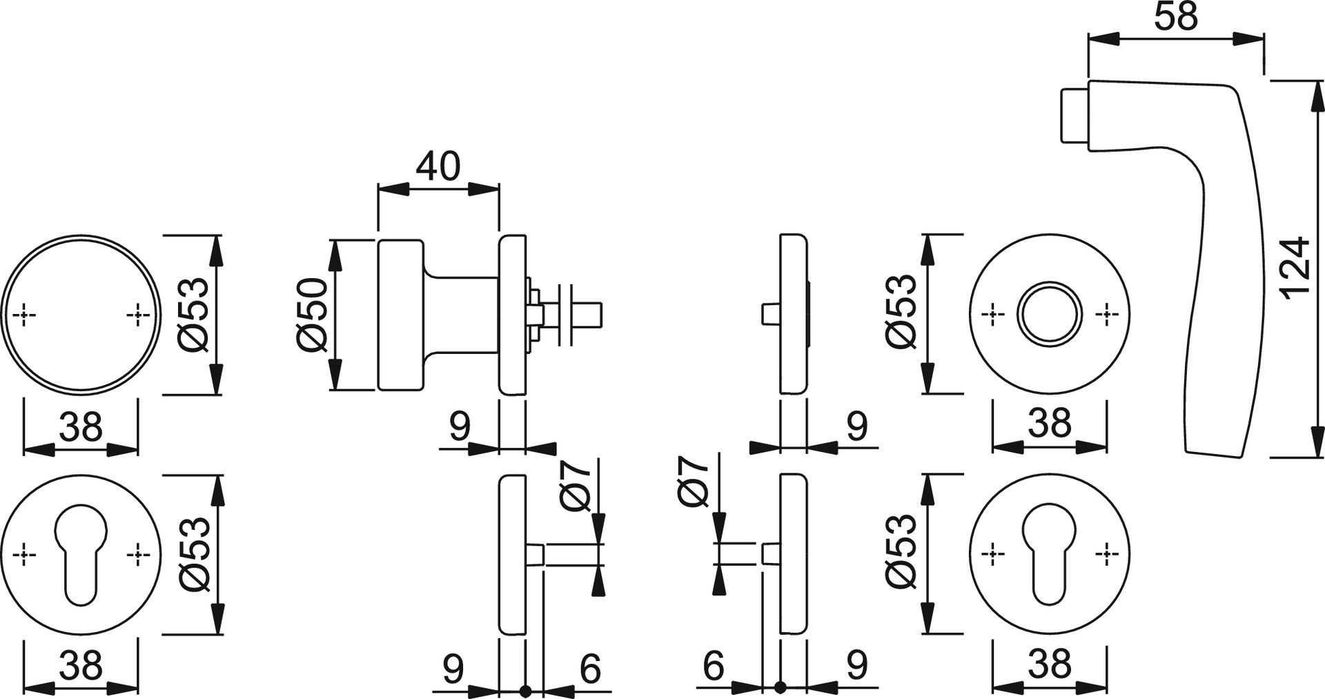 Drückergarnitur Vitória mit runden Rosetten, Türgriffe lose, Rückholfedern rechts/links verwendbar, wartungsfreie Gleitlager, mit Schnellstift-Verbindung, Unterkonstruktion Kunststoff mit Stütznocken, Befestigung verdeckt, durchgehend, wechselseitig, Mehrzweckschrauben.