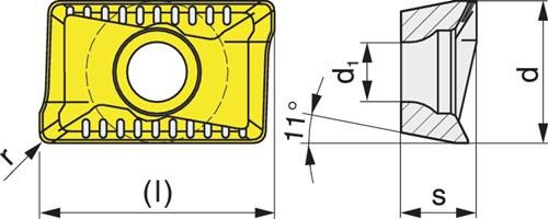 Spanformer-Geometrie M = zur mittleren Bearbeitung Weitere technische Eigenschaften: · d1: 2,88mm · s: 3,5mm · l: 11mm · d: 6,7mm · r: 0,5mm · Anwendungsbereich: Bearbeitung mittel · Schnitttiefe max.: 9 mm in Stahl / 6,8 mm in Rostfrei / 9 mm in Guss / - mm in NE-Metalle / 5,4 mm in Superlegierungen / - mm in gehärtete Stähle · Schnitttiefe min.: 1 mm in Stahl / 1 mm in Rostfrei / 1 mm in Guss / - mm in NE-Metalle / 1 mm in Superlegierungen / - mm in gehärtete Stähle · Vorschub min.: 0,1 mm/U in Stahl / 0,1 mm/U in Rostfrei / 0,1 mm/U in Guss / - mm/U in NE-Metalle / 0,1 mm/U in Superlegierungen / - mm/U in gehärtete Stähle · Vorschub max.: 0,25 mm/U in Stahl / 0,19 mm/U in Rostfrei / 0,25 mm/U in Guss / - mm/U in NE-Metalle / 0,15 mm/U in Superlegierungen / - mm/U in gehärtete Stähle · Vc min.: 235 m/min in Stahl / 140 m/min in Rostfrei / 220 m/min in Guss / - m/min in NE-Metalle / 45 m/min in Superlegierungen / - m/min in gehärtete Stähle · Vc max.: 310 m/min in Stahl / 185 m/min in Rostfrei / 290 m/min in Guss / - m/min in NE-Metalle / 90 m/min in Superlegierungen / - m/min in gehärtete Stähle