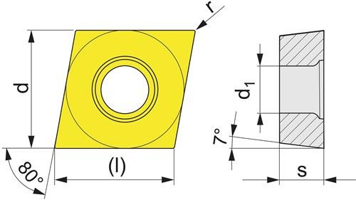 zur Schlichtbearbeitung = F Weitere technische Eigenschaften: · d1: 2,8mm · s: 2,38mm · l: 6,4mm · d: 6,35mm · r: 0,4mm · Anwendungsbereich: Bearbeitung Schlicht · Schnitttiefe max.: 1,5 mm in Stahl / 1,1 mm in Rostfrei / 1,5 mm in Guss / - mm in NE-Metalle / 0,9 mm in Superlegierungen / - mm in gehärtete Stähle · Schnitttiefe min.: 0,4 mm in Stahl / 0,4 mm in Rostfrei / 0,4 mm in Guss / - mm in NE-Metalle / 0,4 mm in Superlegierungen / - mm in gehärtete Stähle · Vorschub min.: 0,08 mm/U in Stahl / 0,08 mm/U in Rostfrei / 0,08 mm/U in Guss / - mm/U in NE-Metalle / 0,08 mm/U in Superlegierungen / - mm/U in gehärtete Stähle · Vorschub max.: 0,2 mm/U in Stahl / 0,15 mm/U in Rostfrei / 0,2 mm/U in Guss / - mm/U in NE-Metalle / 0,12 mm/U in Superlegierungen / - mm/U in gehärtete Stähle · Vc min.: 160 m/min in Stahl / 95 m/min in Rostfrei / 150 m/min in Guss / - m/min in NE-Metalle / 30 m/min in Superlegierungen / - m/min in gehärtete Stähle · Vc max.: 230 m/min in Stahl / 135 m/min in Rostfrei / 215 m/min in Guss / - m/min in NE-Metalle / 65 m/min in Superlegierungen / - m/min in gehärtete Stähle