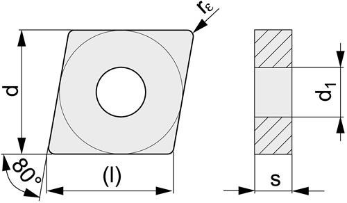 zur mittleren Bearbeitung = M Weitere technische Eigenschaften: · d1: 5,16mm · s: 4,76mm · l: 12,9mm · d: 12,7mm · r: 0,8mm · Anwendungsbereich: Bearbeitung mittel · Schnitttiefe max.: 6 mm in Stahl / - mm in Rostfrei / 6 mm in Guss / - mm in NE-Metalle / - mm in Superlegierungen / 1,5 mm in gehärtete Stähle · Schnitttiefe min.: 0,8 mm in Stahl / - mm in Rostfrei / 0,8 mm in Guss / - mm in NE-Metalle / - mm in Superlegierungen / 0,3 mm in gehärtete Stähle · Vorschub min.: 0,17 mm/U in Stahl / - mm/U in Rostfrei / 0,17 mm/U in Guss / - mm/U in NE-Metalle / - mm/U in Superlegierungen / 0,1 mm/U in gehärtete Stähle · Vorschub max.: 0,6 mm/U in Stahl / - mm/U in Rostfrei / 0,6 mm/U in Guss / - mm/U in NE-Metalle / - mm/U in Superlegierungen / 0,2 mm/U in gehärtete Stähle · Vc min.: 240 m/min in Stahl / - m/min in Rostfrei / 225 m/min in Guss / - m/min in NE-Metalle / - m/min in Superlegierungen / 45 m/min in gehärtete Stähle · Vc max.: 330 m/min in Stahl / - m/min in Rostfrei / 310 m/min in Guss / - m/min in NE-Metalle / - m/min in Superlegierungen / 65 m/min in gehärtete Stähle