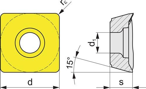 Spanformer-Geometrie M = zur mittleren Bearbeitung Weitere technische Eigenschaften: · d1: 4,4mm · s: 5mm · l: 12,7mm · d: 12,7mm · r: 0,8mm · Anwendungsbereich: Bearbeitung mittel · Schnitttiefe max.: 10 mm in Stahl / 7,5 mm in Rostfrei / 10 mm in Guss / - mm in NE-Metalle / 6 mm in Superlegierungen / - mm in gehärtete Stähle · Schnitttiefe min.: 1 mm in Stahl / 1 mm in Rostfrei / 1 mm in Guss / - mm in NE-Metalle / 1 mm in Superlegierungen / - mm in gehärtete Stähle · Vorschub min.: 0,1 mm/U in Stahl / 0,1 mm/U in Rostfrei / 0,1 mm/U in Guss / - mm/U in NE-Metalle / 0,1 mm/U in Superlegierungen / - mm/U in gehärtete Stähle · Vorschub max.: 0,25 mm/U in Stahl / 0,19 mm/U in Rostfrei / 0,25 mm/U in Guss / - mm/U in NE-Metalle / 0,15 mm/U in Superlegierungen / - mm/U in gehärtete Stähle · Vc min.: 165 m/min in Stahl / 95 m/min in Rostfrei / 155 m/min in Guss / - m/min in NE-Metalle / 30 m/min in Superlegierungen / - m/min in gehärtete Stähle · Vc max.: 225 m/min in Stahl / 135 m/min in Rostfrei / 210 m/min in Guss / - m/min in NE-Metalle / 65 m/min in Superlegierungen / - m/min in gehärtete Stähle