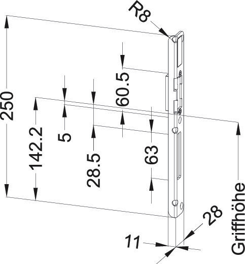 WINKHAUS Winkelschließblech A 28/11 S AVU9 R8 FA; Produkttyp: Winkelschließblech; Produkttyp (Hersteller): Winkelschließblech; Ausfräsung: mit Fallen und Riegelausschnitt; Material: Stahl; Einsatzbereich: Türrahmen; Form: kantig; DIN-Richtung: DIN Rechts; Farbe: silberfarben; Oberfläche: matt verchromt; Schließblechbreite: 28 mm; Schließblechlänge: 250 mm