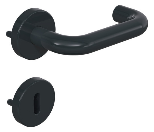 Türdrücker Modell 111R in U-Form aus Polyamid mit durchgehendem Stahlkern bis in das Drückerende, durchgängig eingefärbt, Durchmesser 20 mm, mit Ansatzführung und Rastnut, Montage durch einfaches Einrasten der Türdrücker in die auf der Tür vormontierten Unterteile.