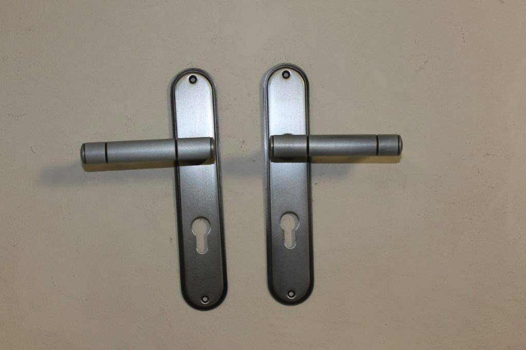 Drückergarnitur inklusive Zubehör im Material Eisen Stahlgrau.