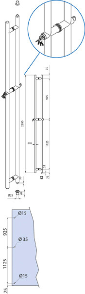 Oben / unten abschließbarer Stoßgriff DUOLOCK H mit Schloss und geraden Stützen, Stangendurchmesser 35 mm, zur paarweisen Befestigung an Glasdrehtüren, inklusive 2 Bodenhülsen unten / oben Höhe 48 mm, Durchmesser 25 mm.